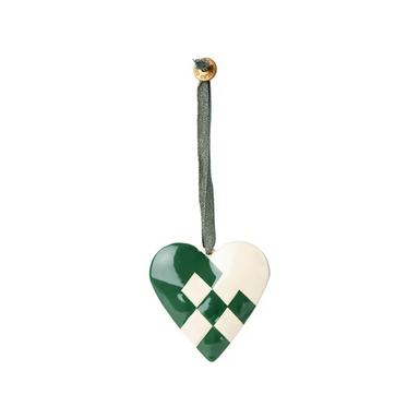 Infuse your holiday decor with the timeless charm of the Maileg Small Dark Green Metal Heart Ornament. Hand-painted with intricate details, this cl...
