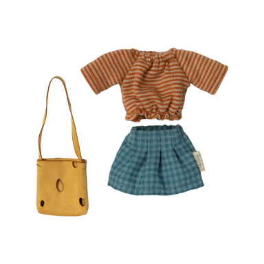 A loose set of clothes for a mouse in size mum/dad. This set includes a skirt, a blouse and a bag with cheese holes *Mouse is not included.