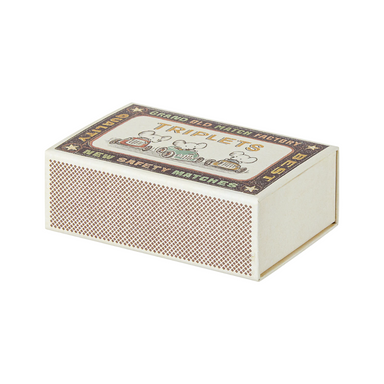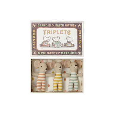 Surprise—it's triplets! Not two, but three adorable baby mice snuggled together in their cozy matchbox bed. Dressed in charming striped outfits, th...