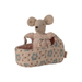 A small baby mouse in a soft and striped knitted suit. It sleeps for hours in its little quilted carry cot.