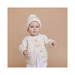 Featuring a gentle Cream base, this Cardigan's welcoming tiny hearts will have your little one feeling like they're wrapped in your love. Featuring hearts in our colors Blush, Rose, Bowie Grey, and Mist. Don't forget the matching hat and mittens.
