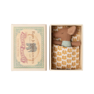 A cherished Maileg favourite, this Baby Mouse arrives snugly tucked inside his own matchbox bed. Wearing a cosy spotted sleeper and a soft blue bow...