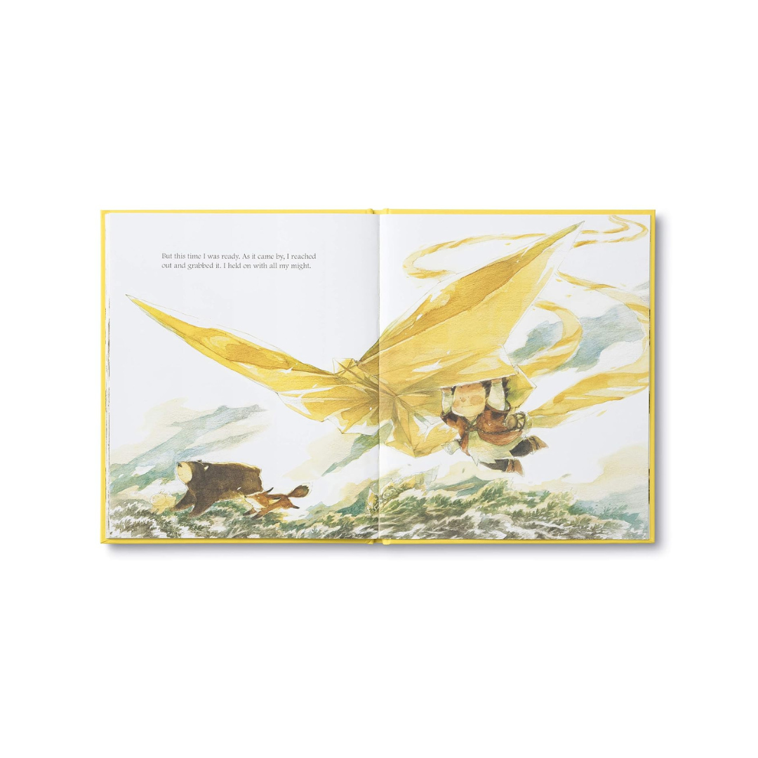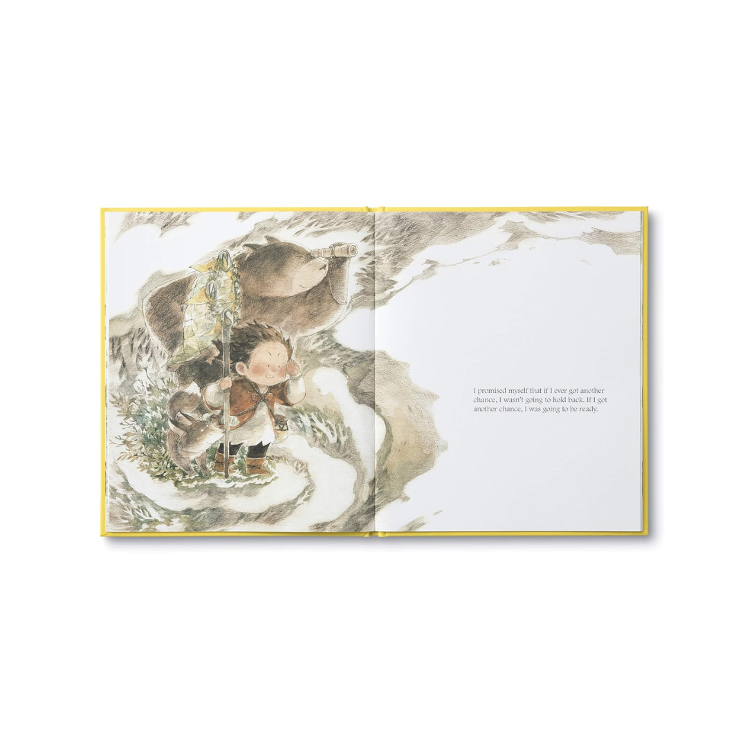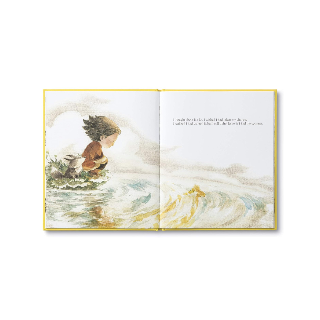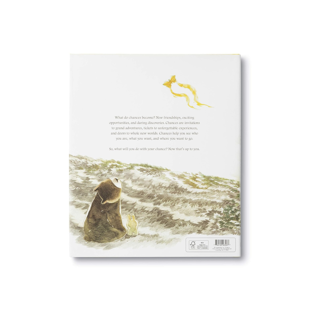 In this story, a child is visited by his first chance and unsure what to do with it, he lets it go. Later on, when a new chance arrives he reaches for it, but this time he misses and falls. Embarrassed and afraid, he begins ignoring each new chance that comes by, even though he still wants to take them. Then one day he realizes that he doesn't need to be brave all the time, just at the right time, to find out what amazing things can happen when he takes a chance!