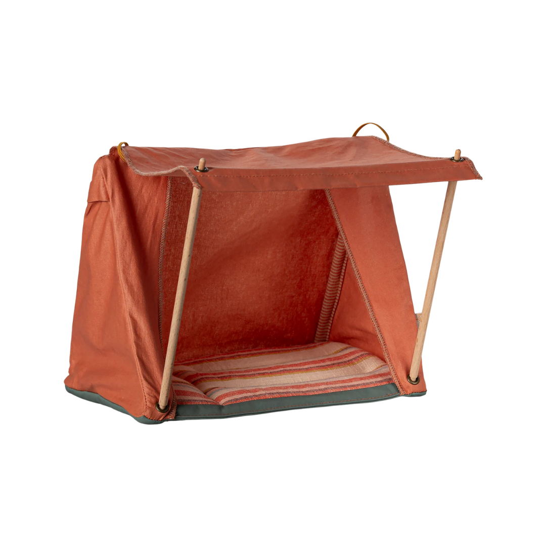 Get ready for a cozy campout with your mice in this charming fold-up tent! Designed with wooden poles to prop open the door and keep out the rain, it’s the perfect little hideaway for sleepovers under the stars. The outer fabric features a coated finish for an authentic camping look and feel. Just don’t forget to remind your tiny travelers to pack their sleeping bags!