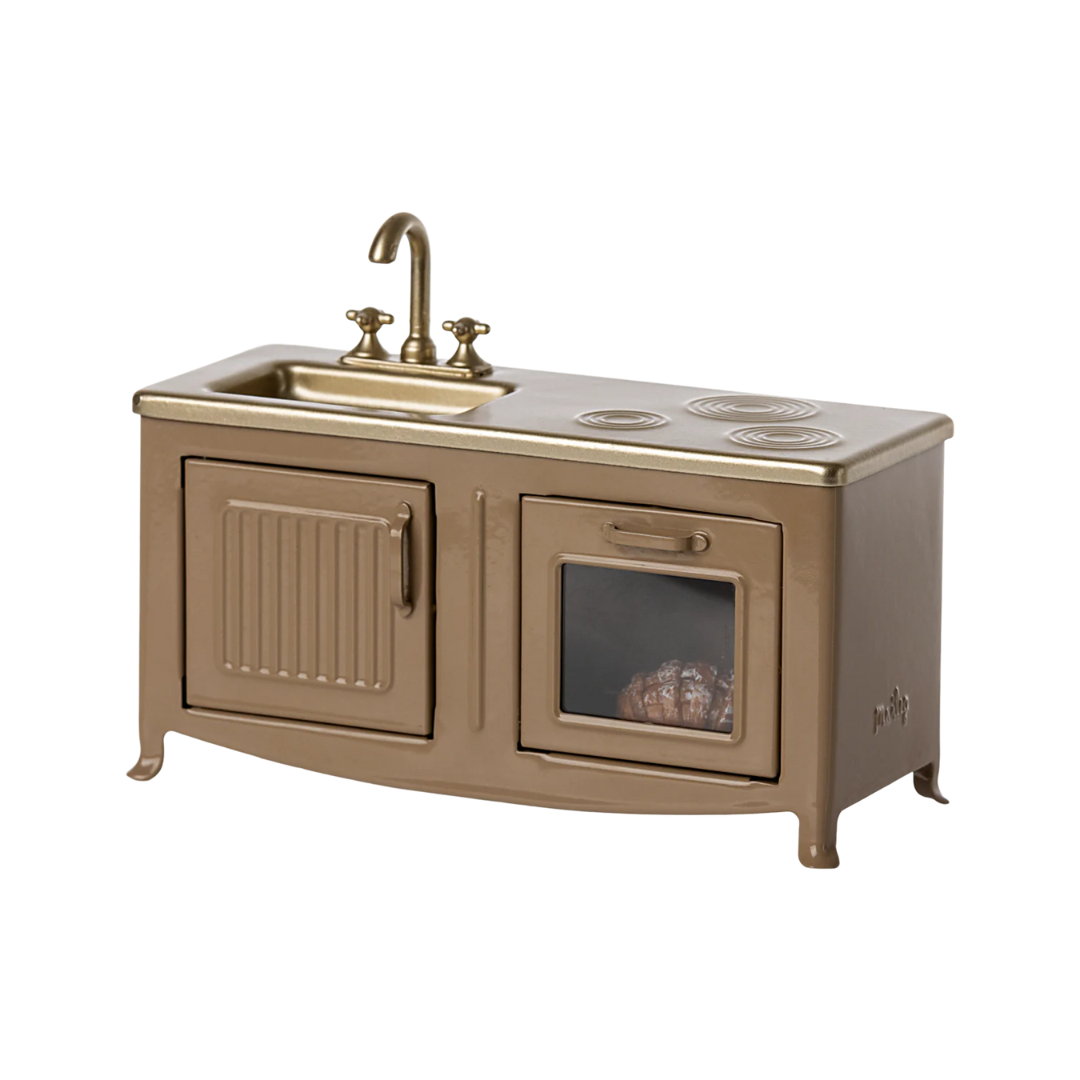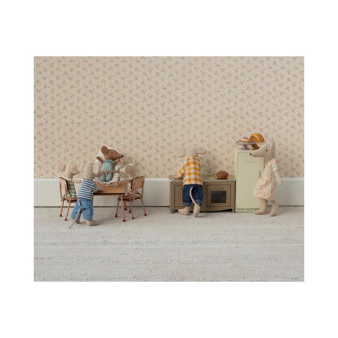 The kitchen is the heart of the home—even for the tiniest of families! Thoughtfully designed with charming details like soft colors, tiny cabinets, a sweet little sink, and an oven complete with a freshly baked pie, this kitchen is just the right size for the mouse family’s favorite gatherings.