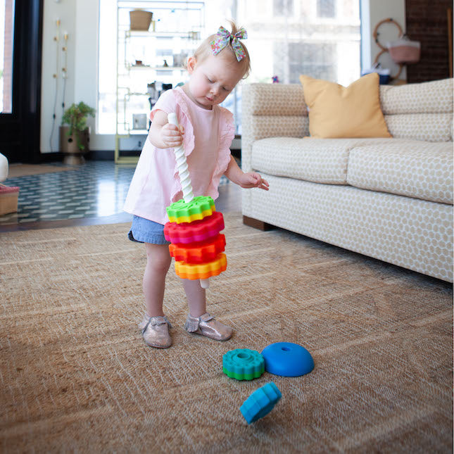 It's a stacking toy with a spin—literally!