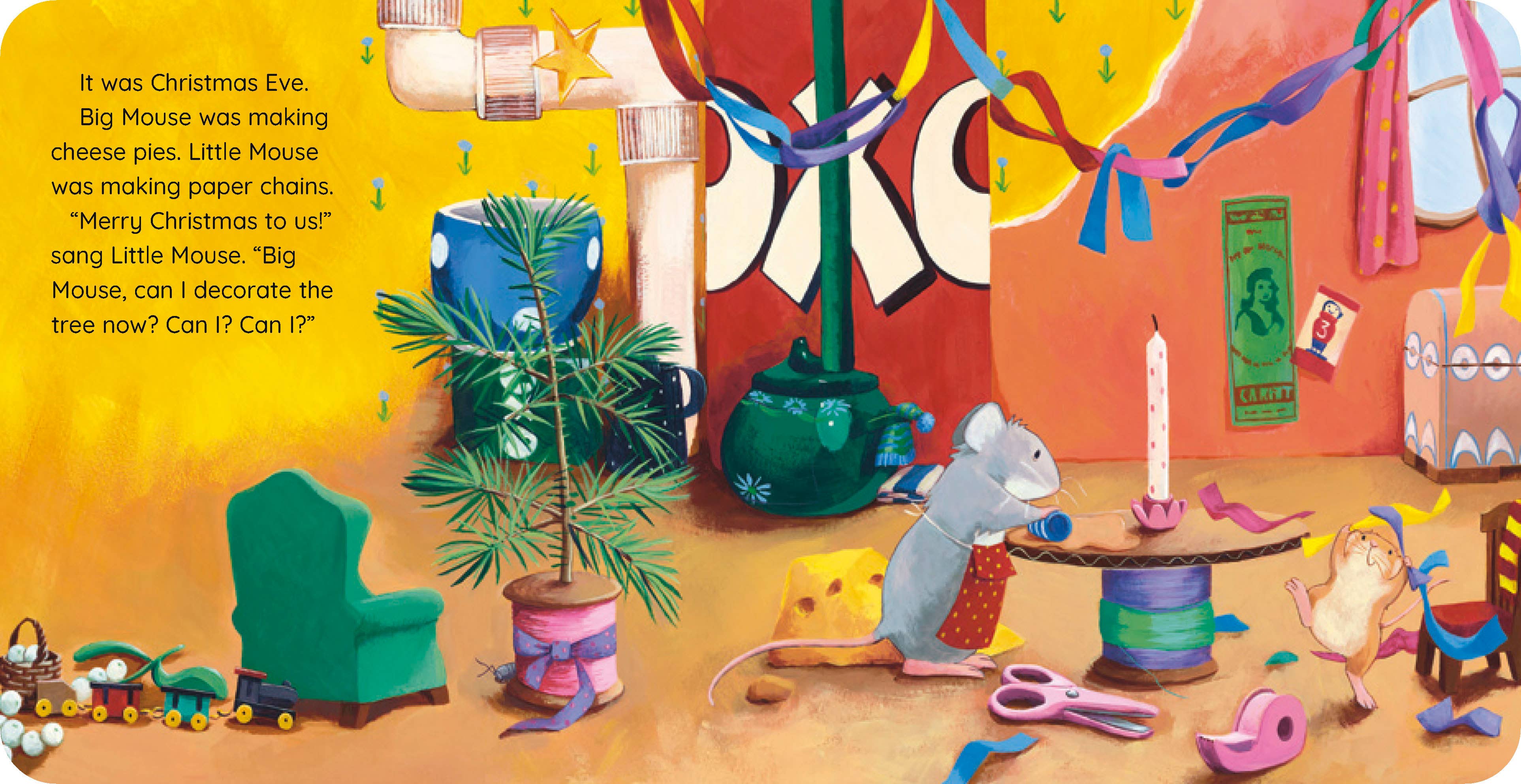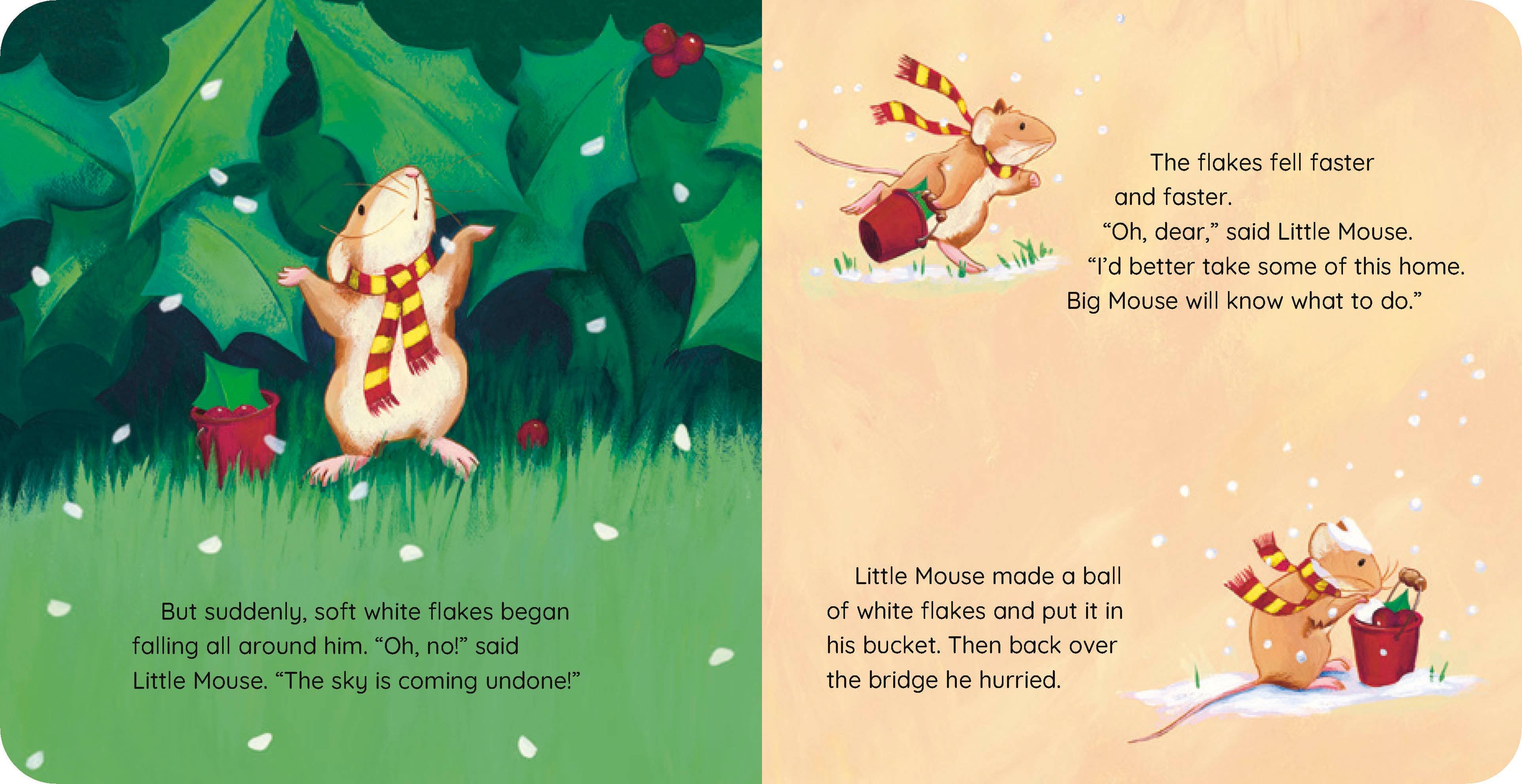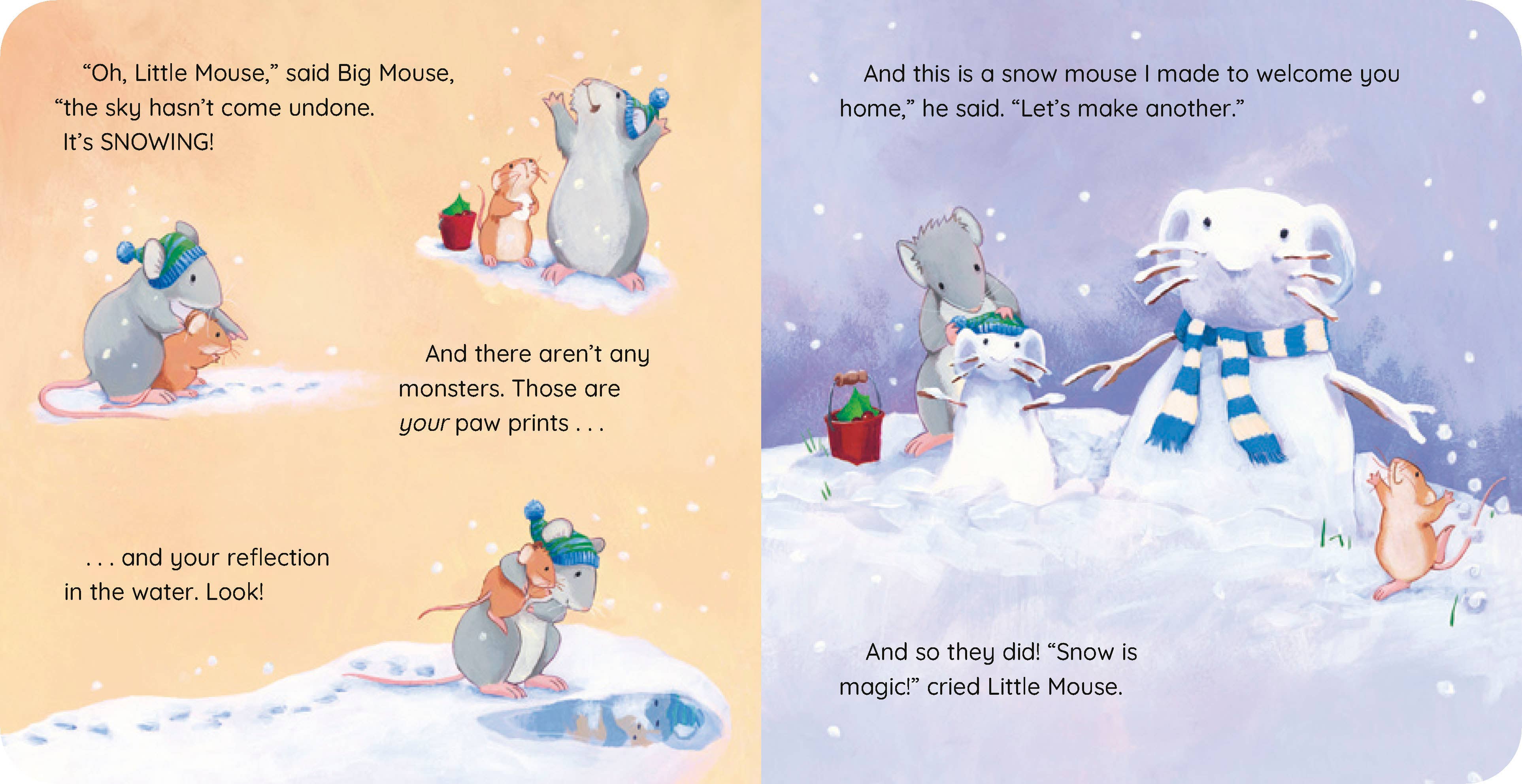 In this sweet story now available in board book format, it's Christmas Eve, and Big Mouse and Little Mouse are decorating the tree. Little Mouse notices that they don't have any holly, so he sets out to find some. It begins to snow, and Little Mouse is scared that the sky is coming apart! Then he sees his reflection in the pond and thinks it's a monster--and when he runs away and discovers paw prints behind him (his own), he thinks the monster is chasing him! Can Big Mouse show him that there really is nothing to be afraid of?